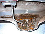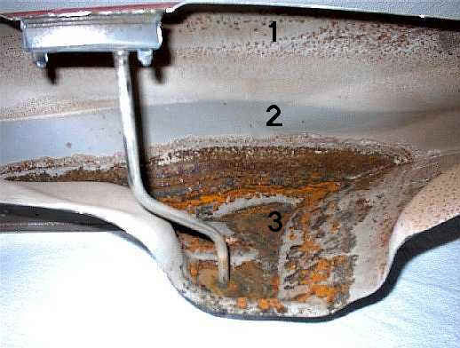 Bild vergrößern | | Nach dem aufschneiden bietet sich dem Betrachter ein desolates Bild. Der Tank hat hier eine Standzeit von ca. 2 Jahren hinter sich, der Schadensverlauf ist genau zu erkennen. 1. Im Deckenbereich punktuelle Korrosion durch Kondenswasser. 2. Hell-Dunkel Zone in welcher Höhe sich das Benzin befand. 3. Starker Rostbefall an den Wänden und dem Boden mit heftigem Lochfraß und Zerstörung der Metallinnenfläche. |